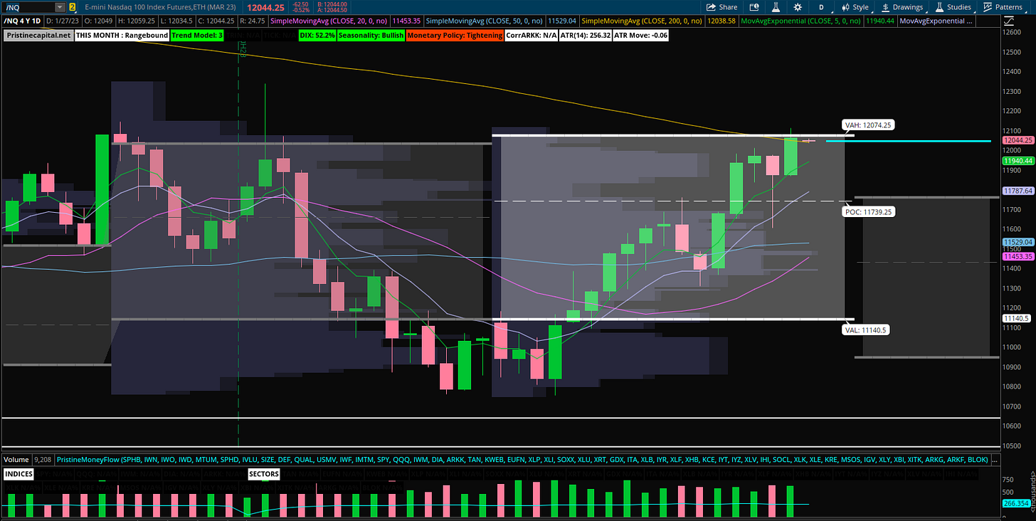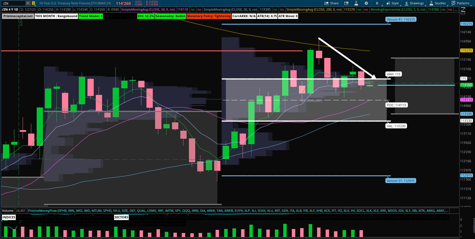 Stronger data also puts upward pressure on treasury yields. The ZN_F 10yr treasury futures contract fell back inside of it’s monthly value area while also putting in it’s first lower high of the new year! Remember, treasuries lead equities, not the other way around.