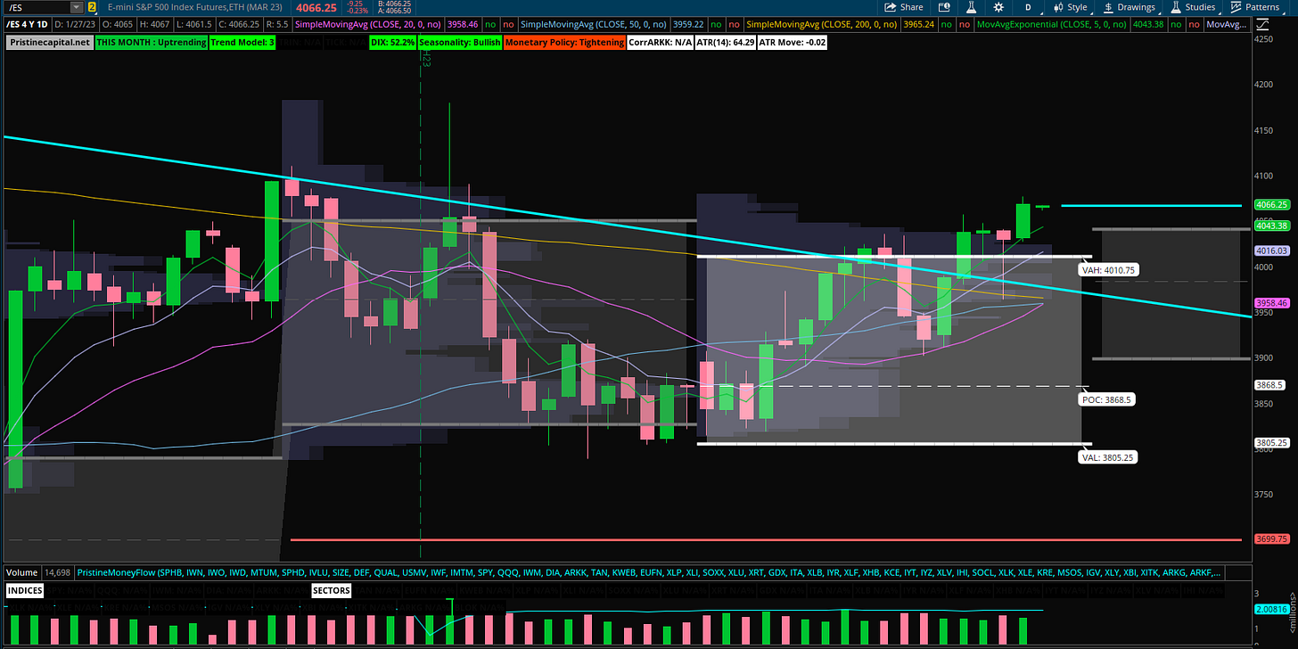 We discussed the potential for a move up to 4100 in last night’s note, and the market made significant progress toward that level today. At the current price of 4066.25, we have 34.75 points of upside to 4100, vs 23 points of downside to the 5-day EMA at 4043. We are playing for scraps ahead of the fed meeting!
