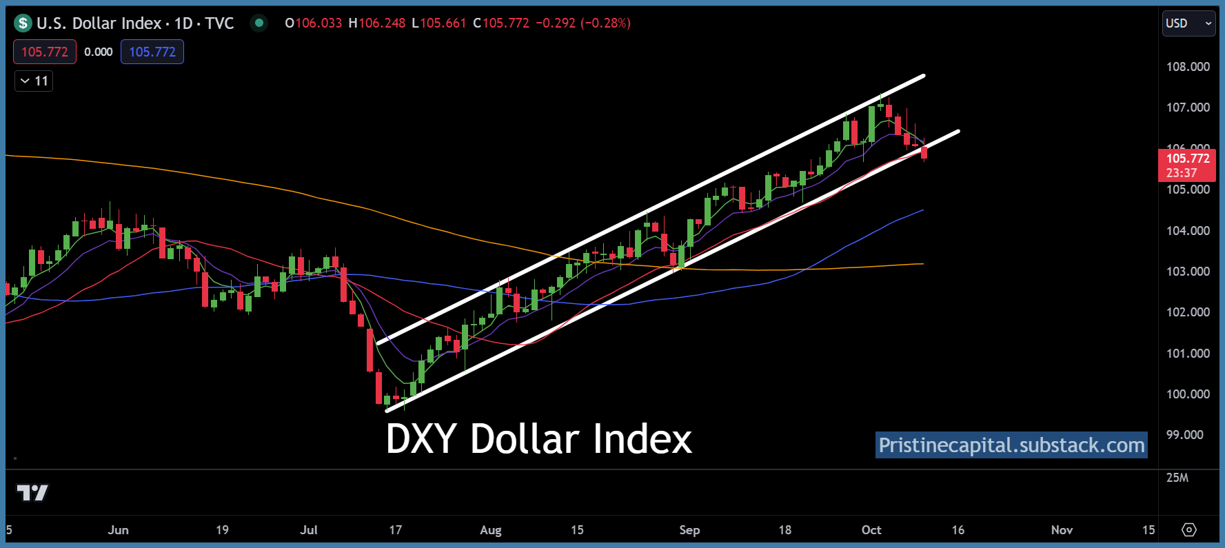 The Dollar index broke below the bottom of the bullish trend channel which is BULLISH for risk assets.