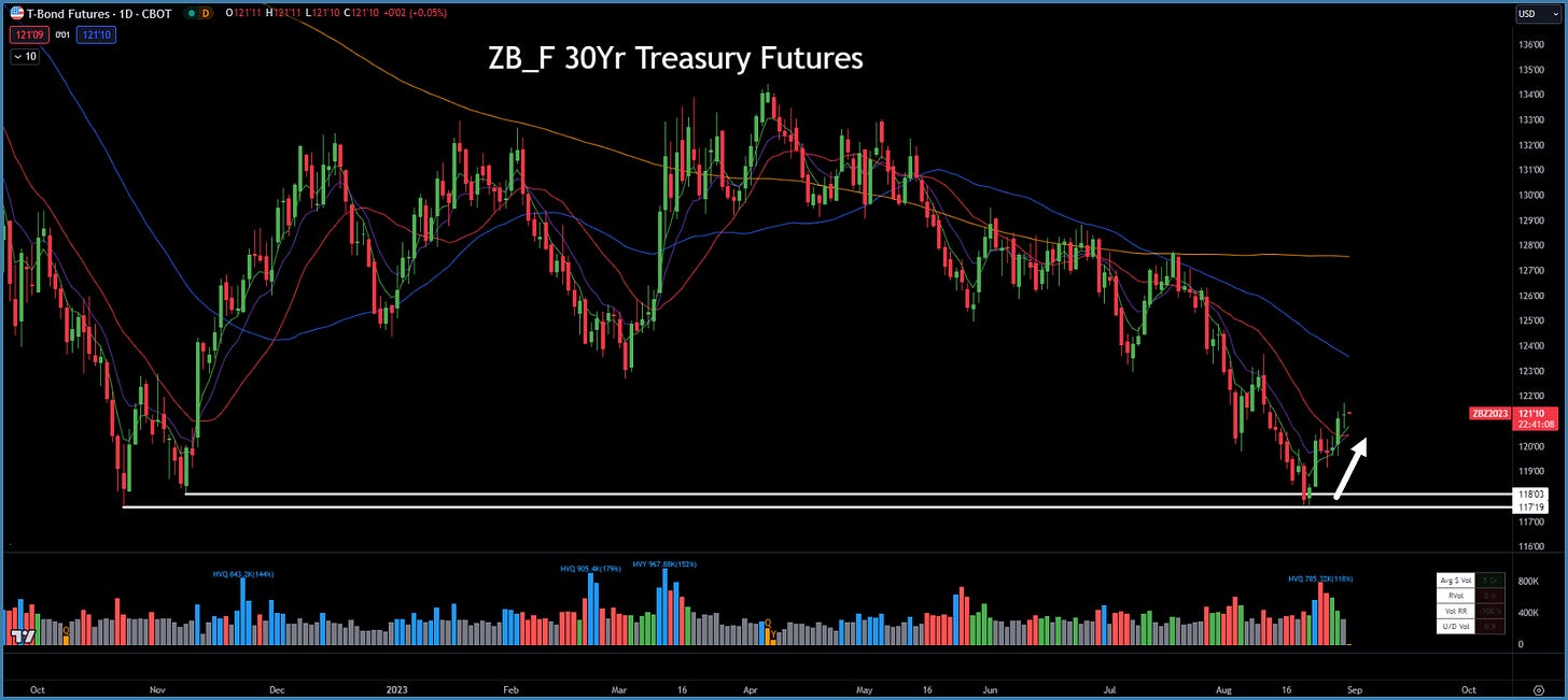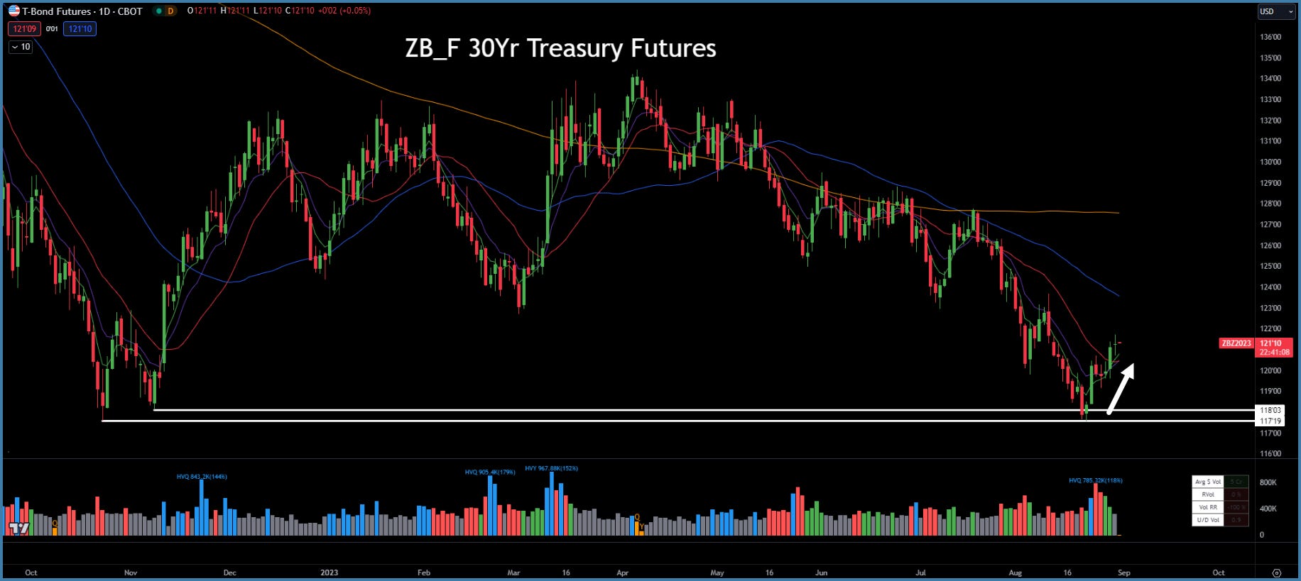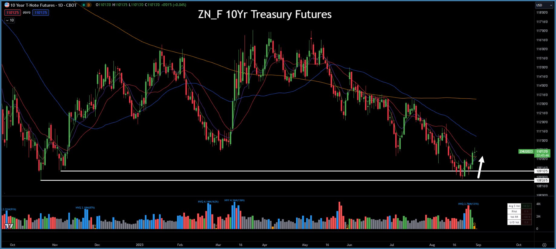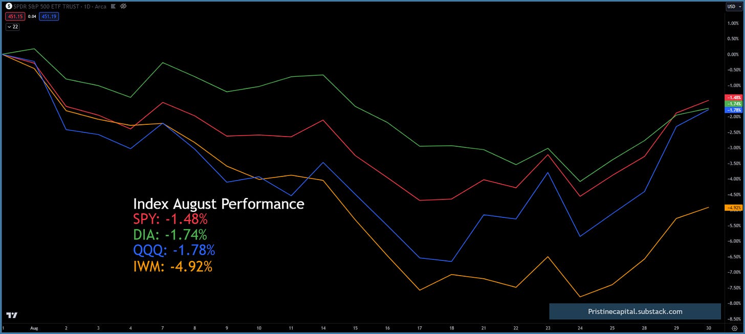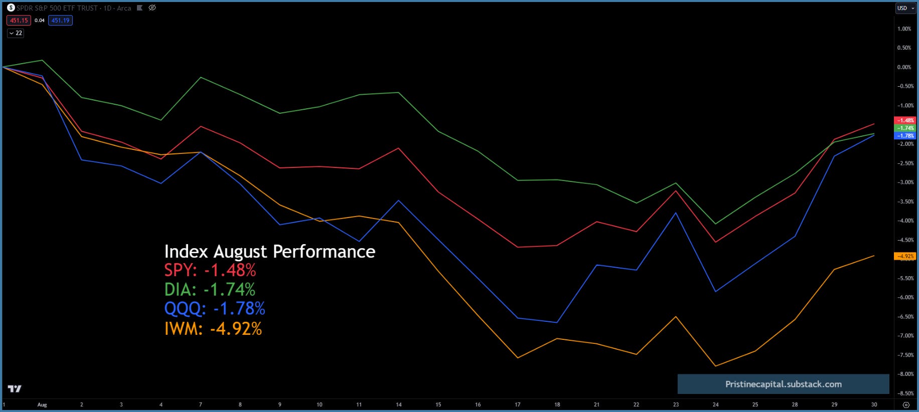In fact, the equity indices recouped the vast majority of their August losses over the past few sessions. Notice that the IWM small caps have not been nearly as resilient as the other indices? Another clue that the market is pricing in an economic slowdown.