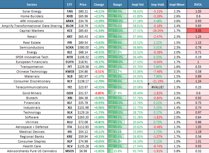 Quite a changing of the guard on our momentum list! The Solar energy TAN ETF is now in our top slot, followed by the Homebuilders XHB and the ARKK innovation ETF. Investors are rotating out more defensive areas of the market like XLP Consumer Staples and XLV Healthcare and going risk-on into CPI: