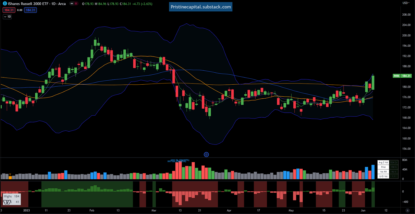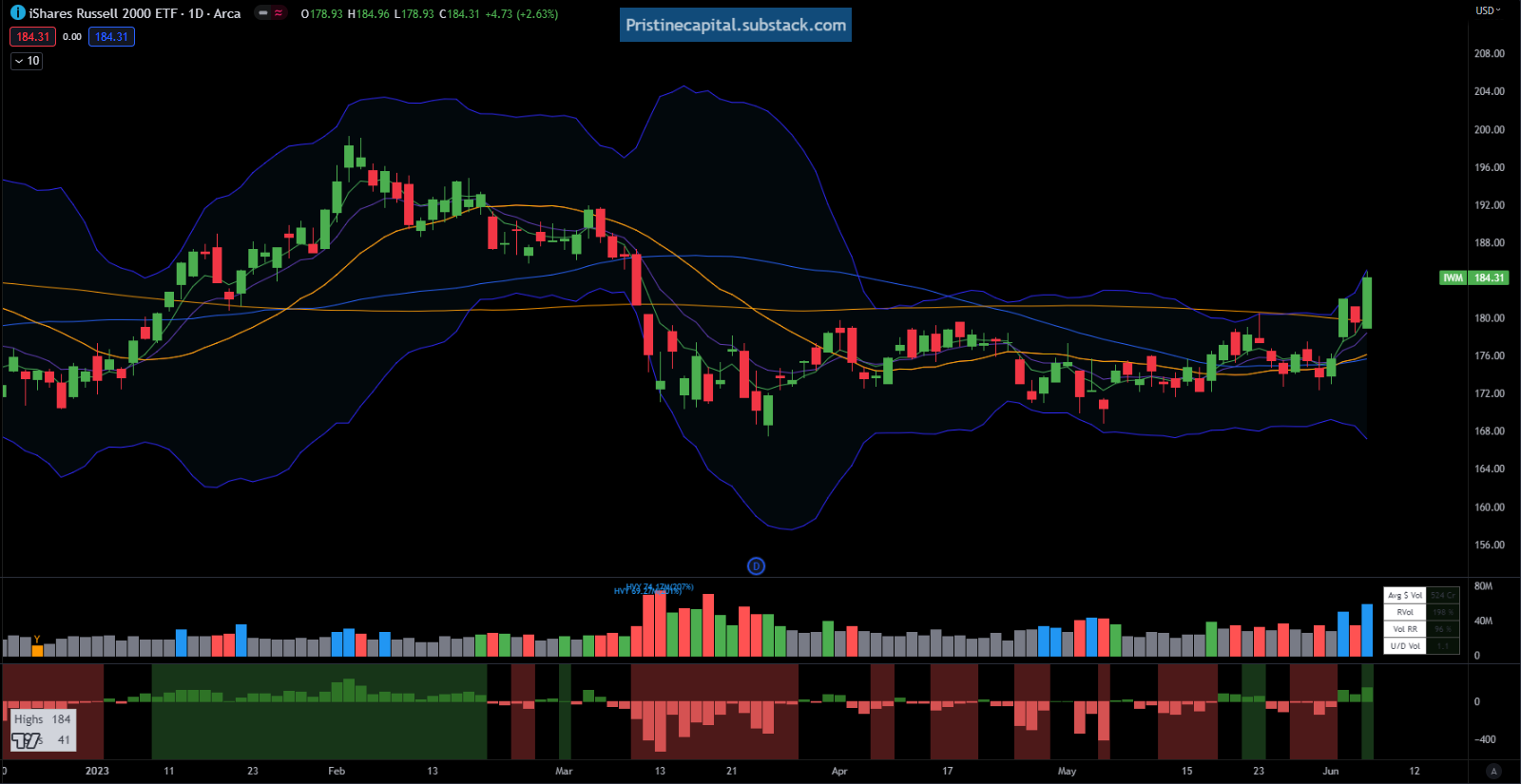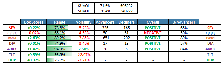 71.6% advancers and a MASSIVE volatility crush across the board. The IWM small caps, which have been the laggard this entire rally, played catch up while QQQ technology lagged and closed in the red.