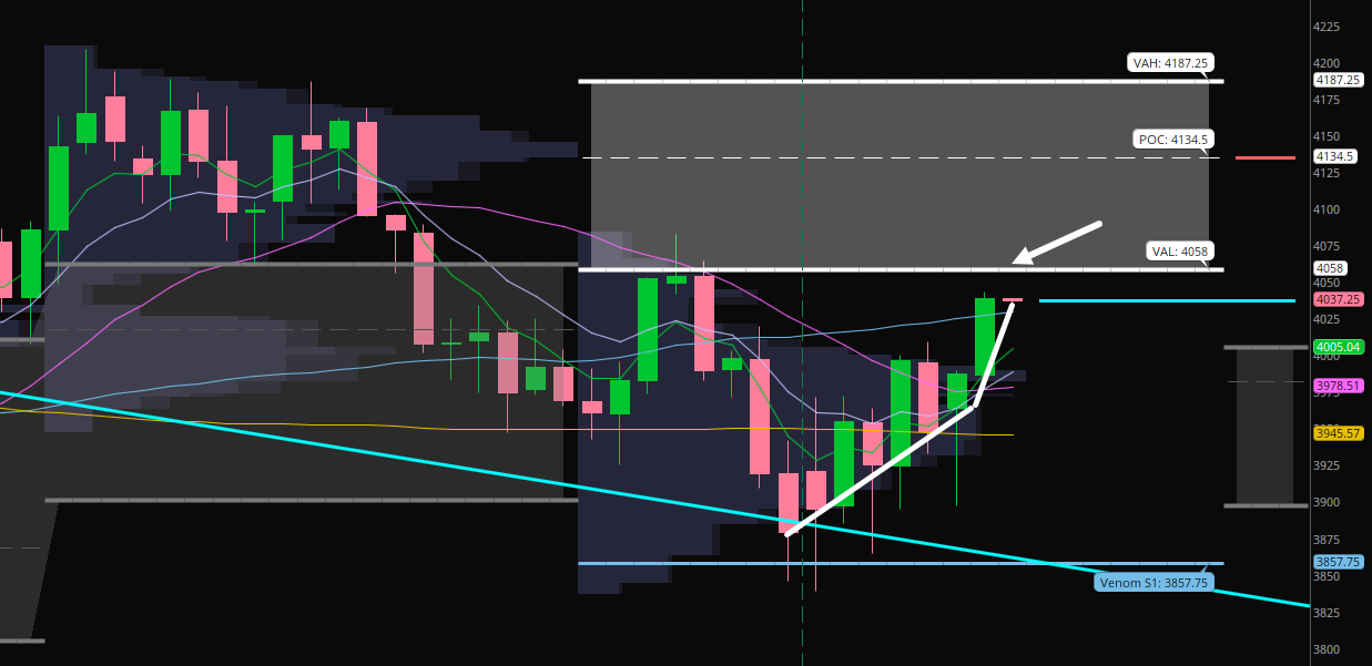 The S&P 500 is trading above all key moving averages, and the angle of ascent is getting steeper! We are approaching resistance at the monthly value area high ~4,058 into tomorrow’s Fed meeting.