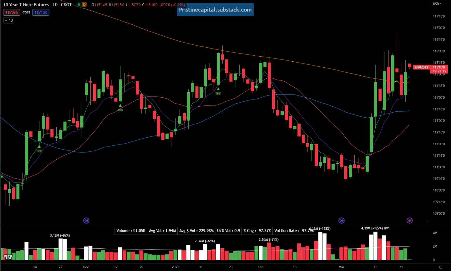 The ZN_F 10yr treasury futures put in a green candle and reversed yesterday’s losses. Treasuries initially zoomed higher as the banking crisis kicked off, and they are now consolidating in time, rather than pulling back in price. The financial system NEEDS treasury yields to stay low, because the lower treasury yields go, the more the unrealized losses on bank balance sheets shrink