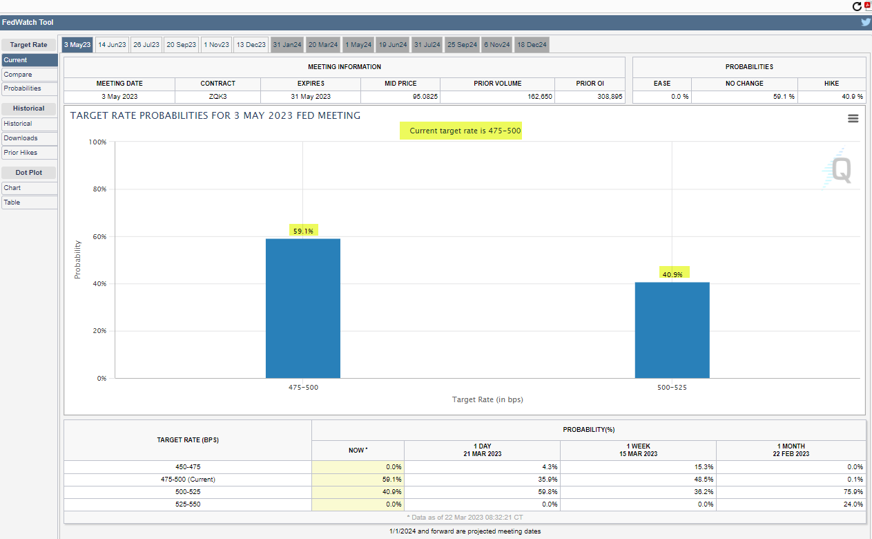 As we were expecting via prior research notes. The fed hiked interest rates by 25 bps today! The target range is now 4.75%-5.00%. That means the interest rate on money market funds is about to take a leg higher! Vamos!!! The market is now pricing in a 59.1% probability that the Fed will pause at the May meeting, and a 40.9% chance that the Fed will do another 25 basis point rate hike.