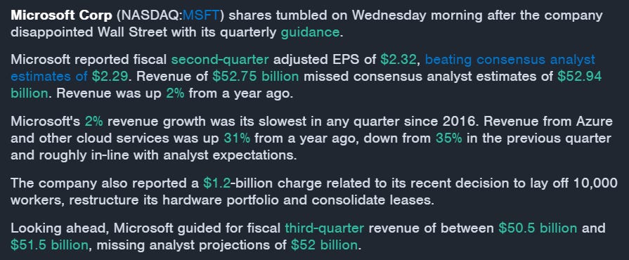 Our story begins with yesterday’s MSFT earnings report. The company put up +2% YoY sales growth and -6% EPS growth, and mentioned that its Azure cloud business growth was decelerating!