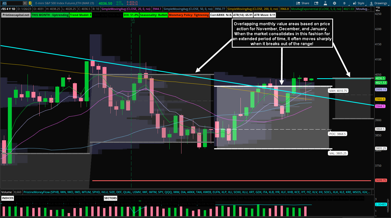Pay close attention here. As much as it may seem like the market is overbought, the market has been rangebound for the past three months, and can move sharply when it breaks out of range (think of a coiled spring). Given that we are trading above the current monthly value area high 4,010.75, I have to give the edge to the bulls for a move up to 4100. If that scenario were to unfold, I’d imagine that almost every market bear would capitulate: