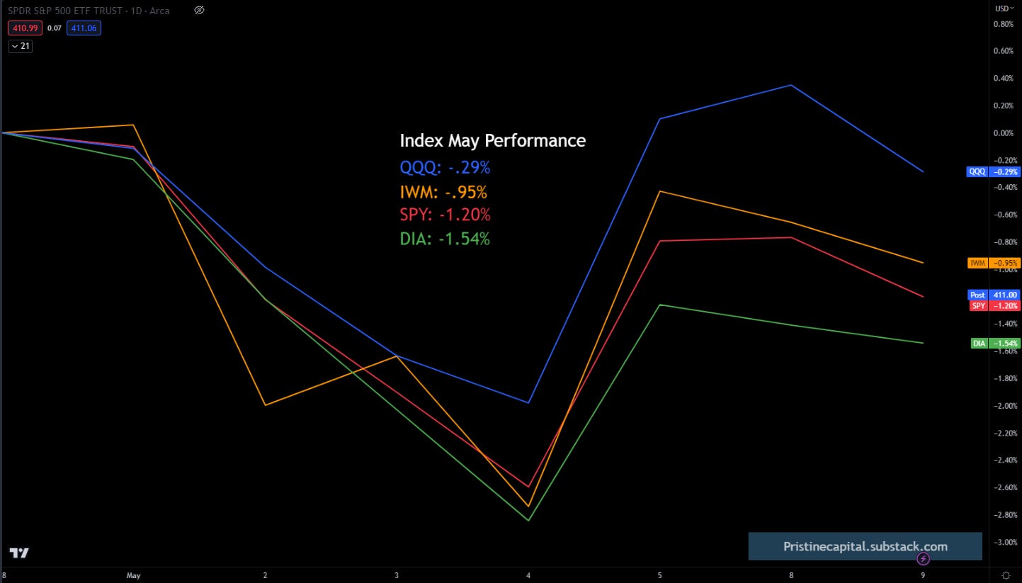 There has been dynamism in earnings movers over the past week, but the indices are all trading in negative territory. In both March and April, the indices flipped from deep red intra-month, to positive territory by month-end. Most players that didn’t do a great job managing their risk were bailed out. Let’s see if this month is more of the same, or if we get a different outcome.