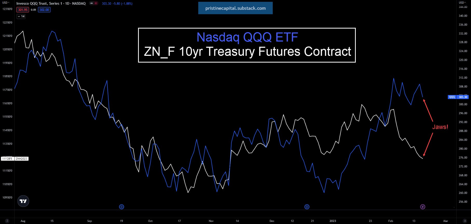 The gap between the Nasdaq QQQ ETF and the 10yr US treasury future began to converge today, but it is still incredibly wide! Treasuries lost all of their year-to-date-gains, while the Nasdaq is still sitting on a year-to-date gain of +14.68%. Let that sink in for a minute🤯