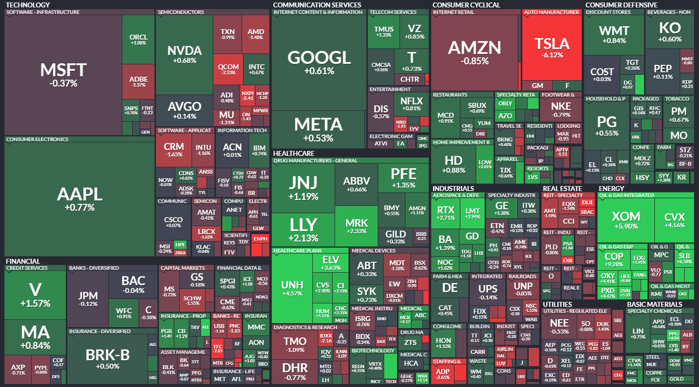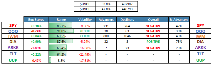 And equities were…mixed. The DIA Dow Jones led with a +.99% advance and ARKK lagged with a -1.88% decline. With 53% advancers and 47% decliners, the market had a rather indecisive tone.