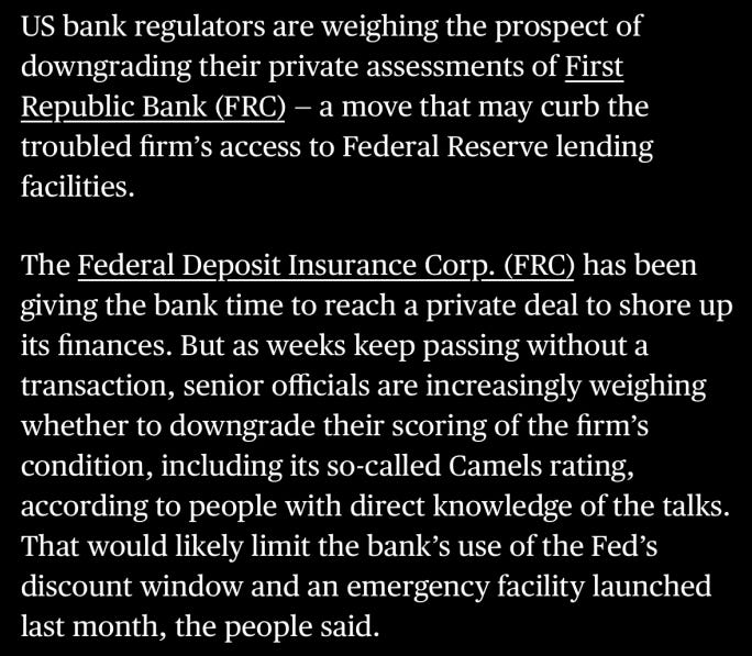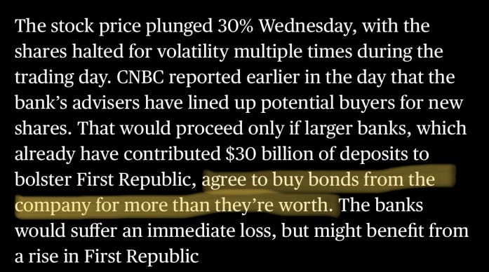 And this is the weirdest part of the whole situation…the only way the deal will go through is if big banks agree to buy the bonds of FRC at a higher price than the bonds are actually worth! This monetary system is a joke.