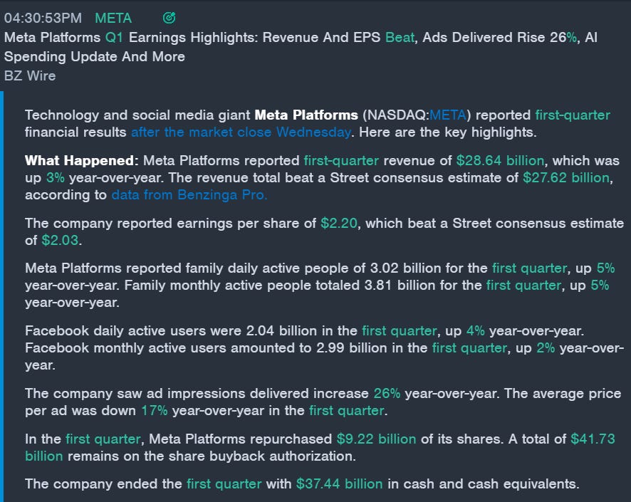 META reported earnings after the bell, and is trading higher in the after hours market