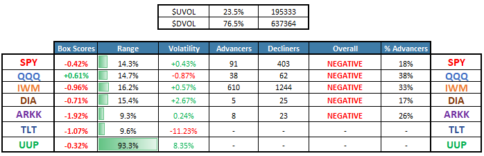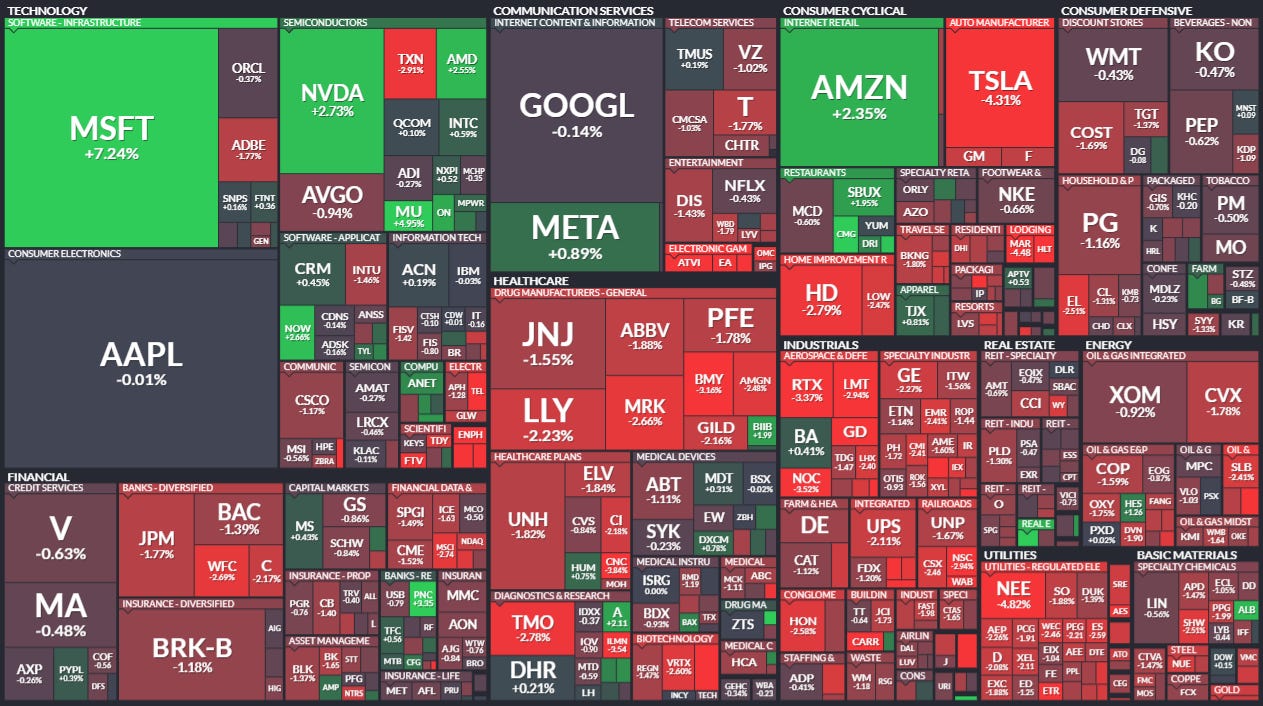 Breadth was weak with only 23.5% advancers. Stocks and treasuries sold off together, and the Nasdaq QQQ finished green largely due to the outstanding performance of MSFT.