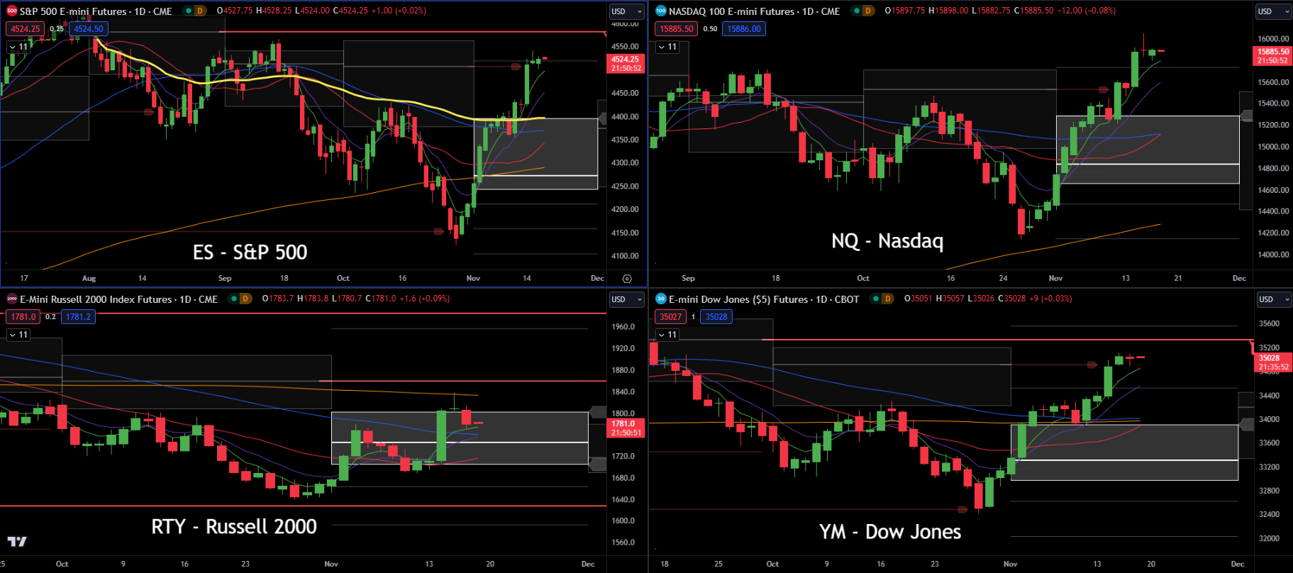 We’ve discussed how short-term overbought the indices were in prior notes. Well guess what?! The 5-day EMA’s just caught up! Every day the indices move sideways, the risk/reward improves. Be patient.