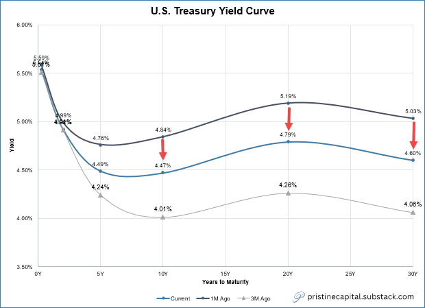 The economic slowdown we are beginning to witness, combined with the inflation deceleration we’ve witnessed over the past year, is putting downward pressure on bond yields across the curve