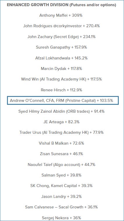 Its official! We finished the 2023 trading year with a +103.5% in the USIC! We placed 9th in the enhanced growth division, and 21st overall out of 352 entrants, putting us in the top 6% of all participants.
