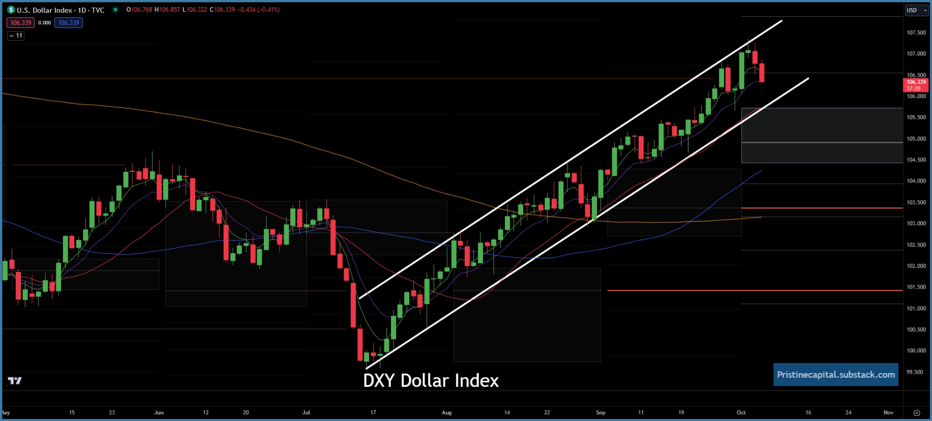 The dollar index put in another red candle and is now testing the 10-day EMA. A weaker dollar equates to looser financial conditions, and looser financial conditions is positive for risk assets!
