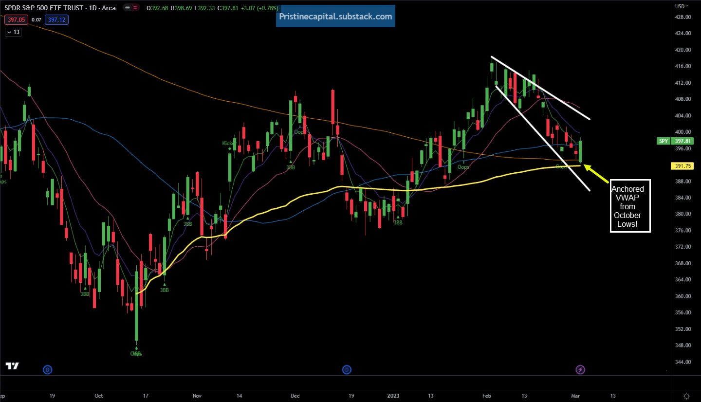And moving over to the S&P 500 SPY ETF, where did we find support? Pretty darn close to the anchored VWAP from the October lows! Could there have been investors that missed the bottom that used this level as their tactical entry? It’s very possible. The fact that we got such a strong reaction off that level tells us how important it is moving forward.