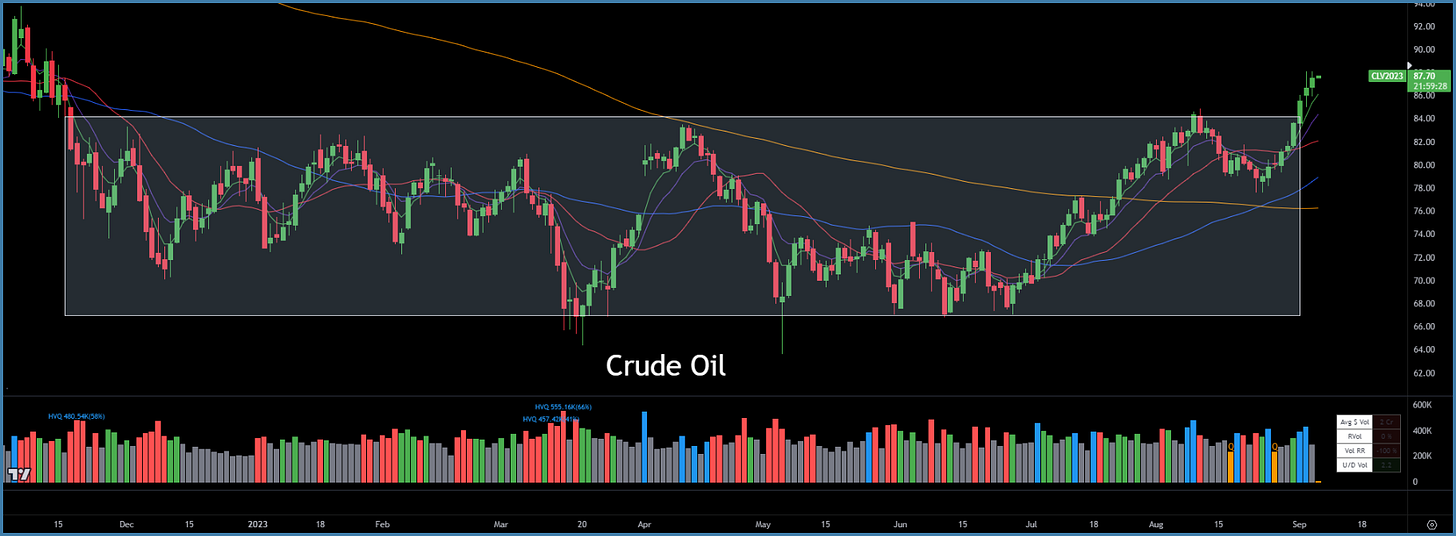 And crude oil continued to climb! Now trading at $87.70/barrel.