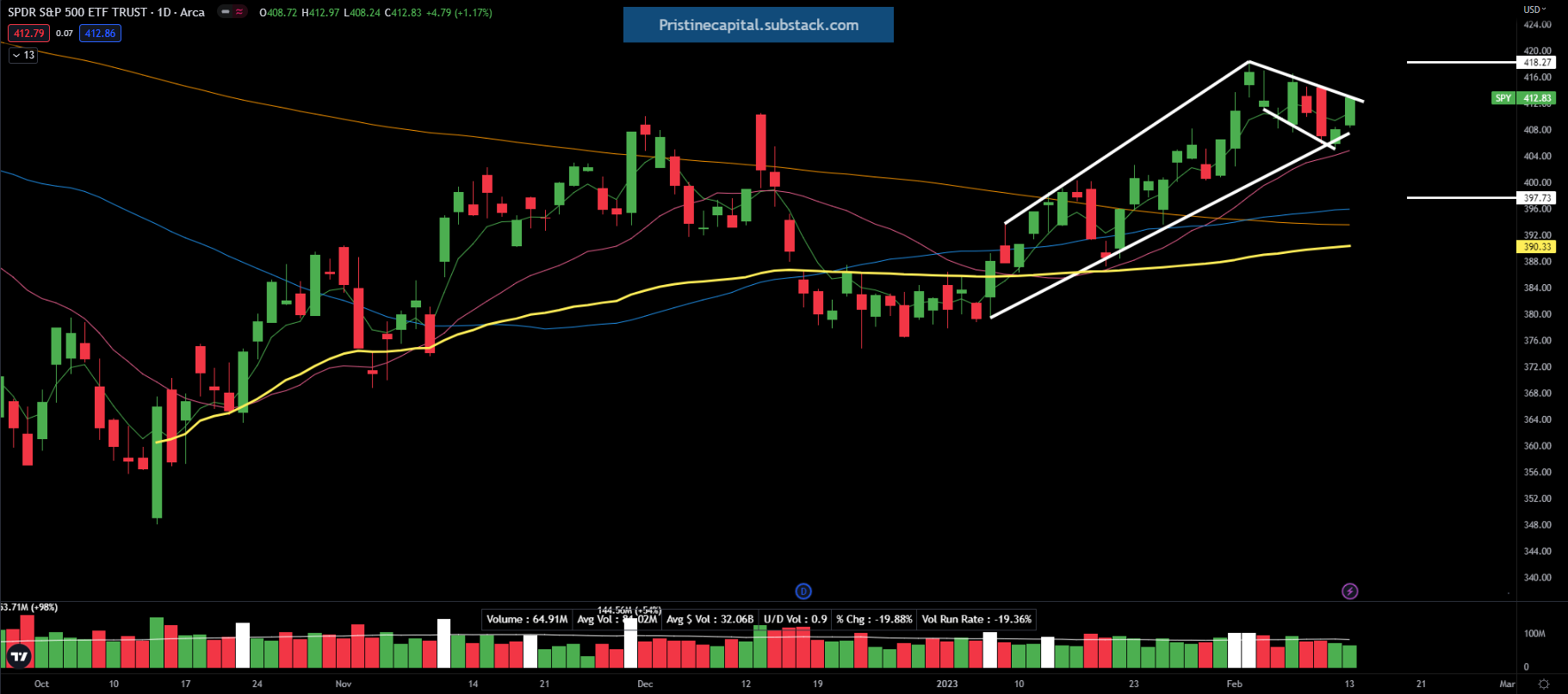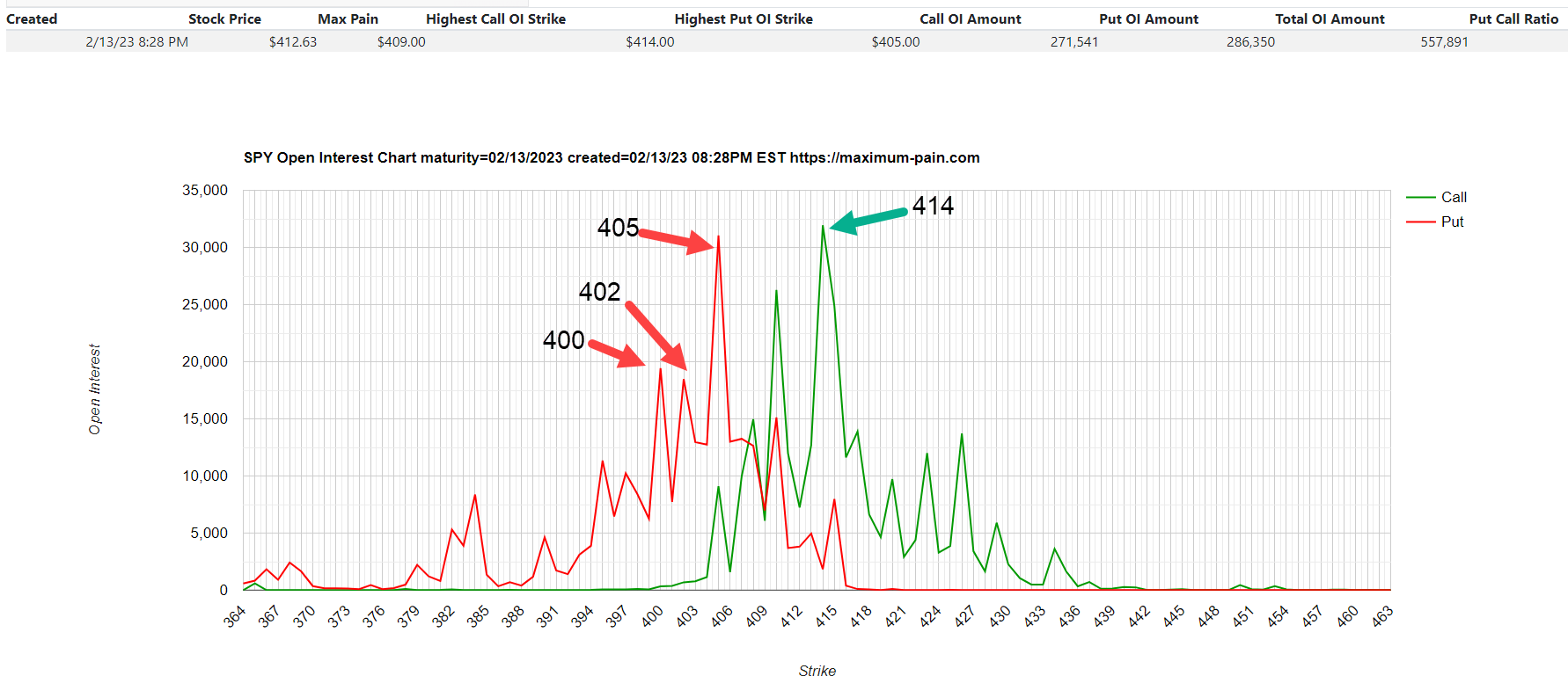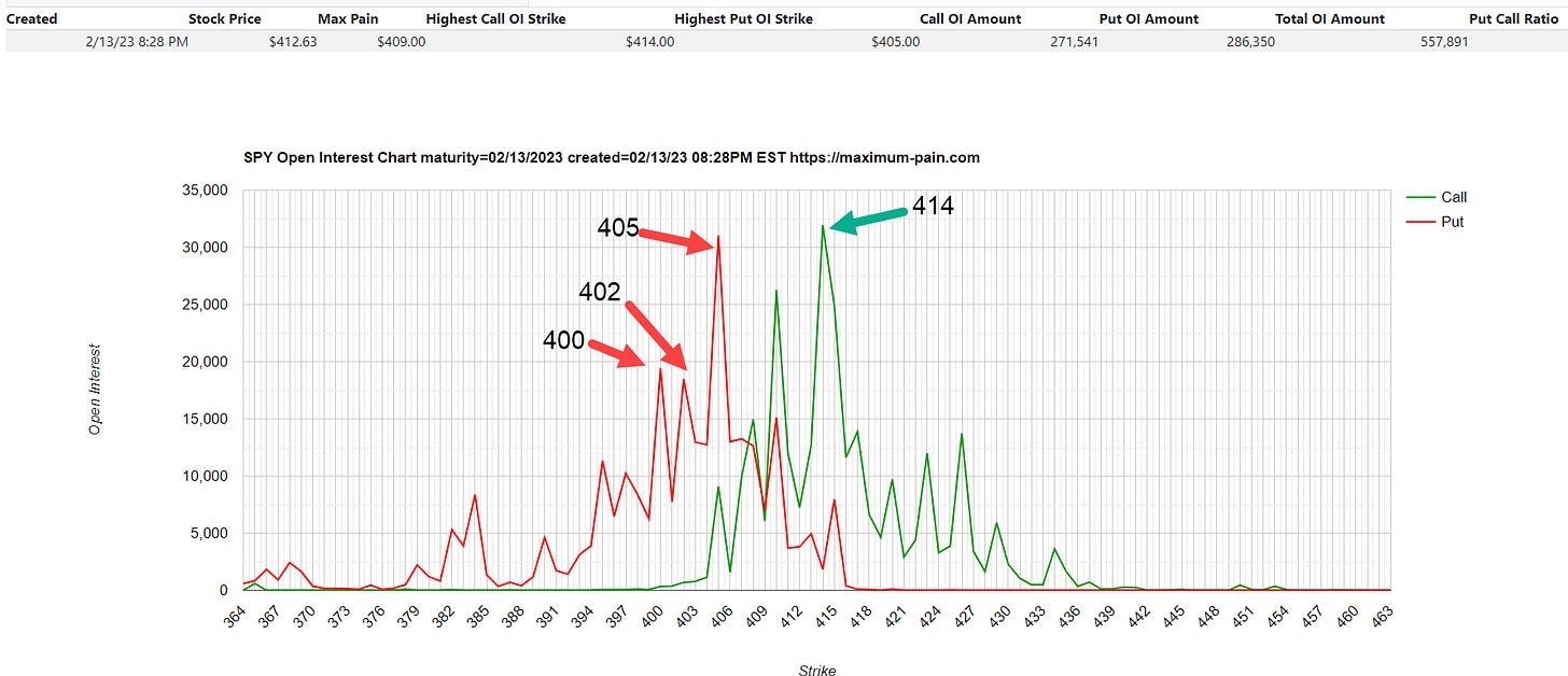 We’ve cited the positive stock buyback associated with legacy put option positions decaying into the 2/17 options expiration for the last two weeks. For today’s 2/13 expiry, there was a heavy concentration of SPY put options at the 400 strike, the 402 strike, and the 405 strike, and a heavy concentration of calls at the 414 strike. Lo and behold, SPY ended the session at 412.83, expiring all of these options worthless! I believe most market participants are reading too much into today’s price action, and that it was just a max pain close into CPI.