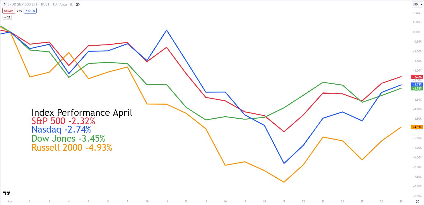 Barring a miracle month-end, the indices are going to finish in negative territory for April, so don’t be discouraged if April wasn’t a banner month in your trading career! Always important to calibrate your expectations.