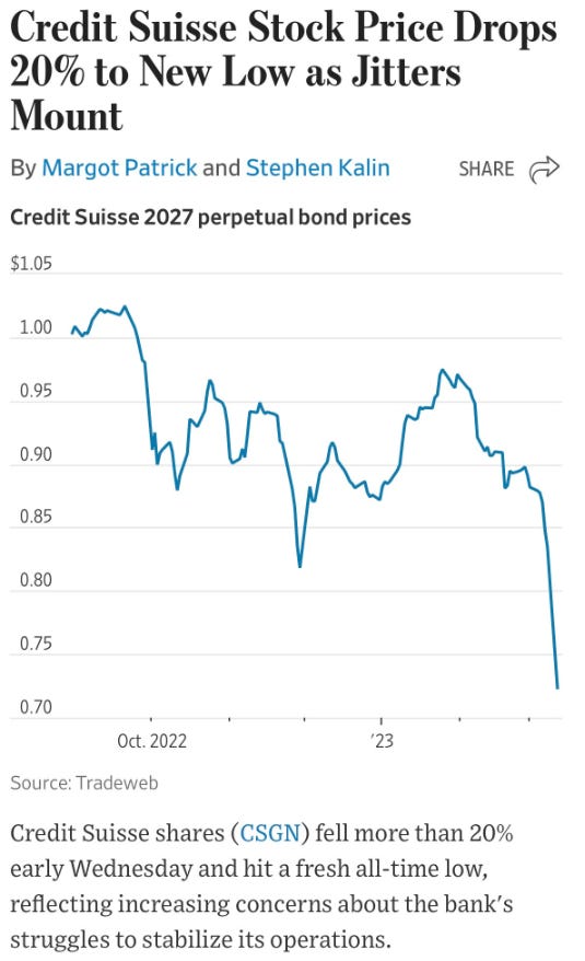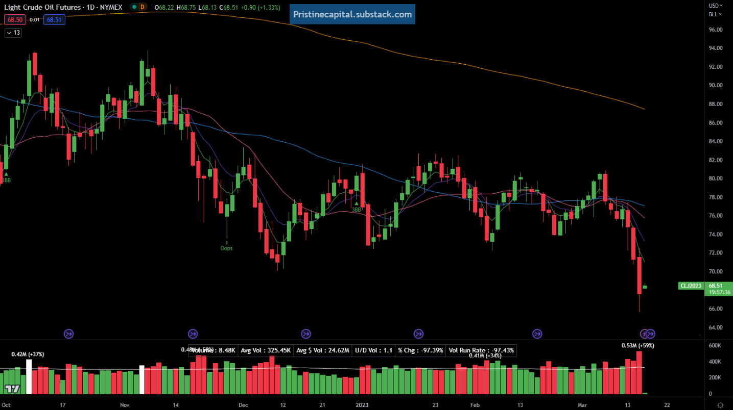 Equity indices finished mixed. The IWM small cap index is a victim of this banking crisis, as it has direct exposure to the regional banks at the heart of the issue. But the Nasdaq QQQ and ARKK innovation ETF finished in positive territory. Not bad all things considering: