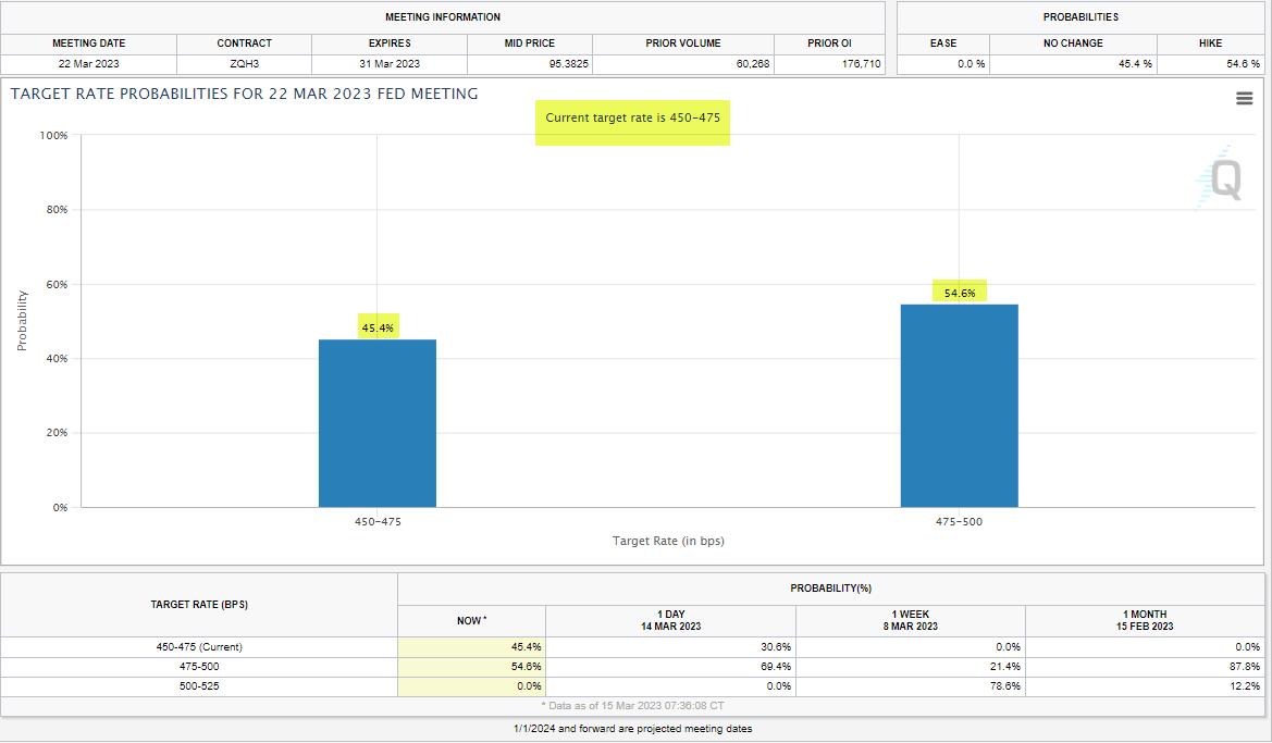 Fed fund futures are pricing in a 45.4% chance of no rate hike at the March 22nd meeting, and a 54.6% chance of a 25 bps hike. It’s a toss-up!
