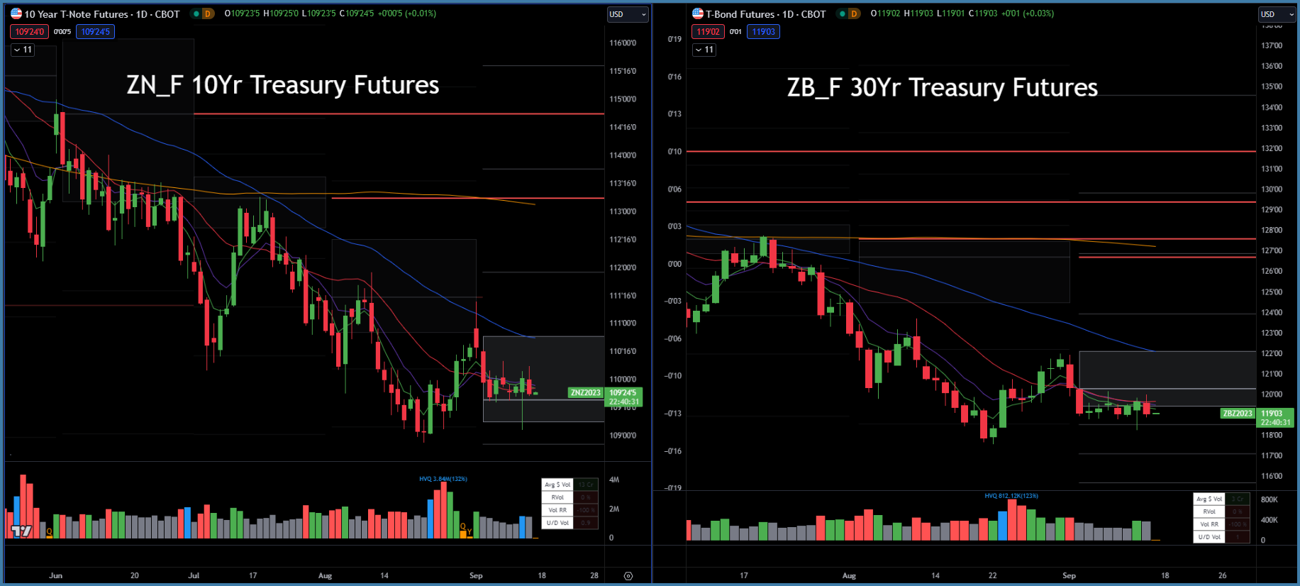 Long-term US treasuries finished the day with red candles, and they are now trading toward the lower end of their tight consolidation patterns. We have no confirmation that the selling in bonds is over.