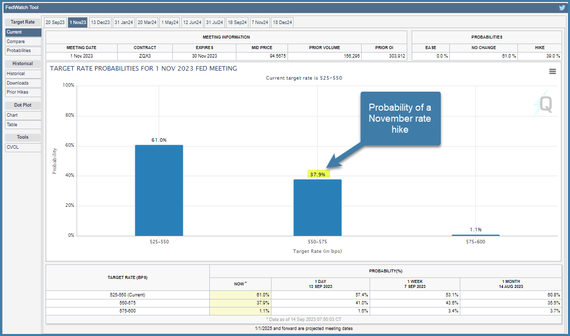 The probability of a November rate hike declined from 41.0% to 37.9%. There is a good chance that the fed hiking cycle is over.