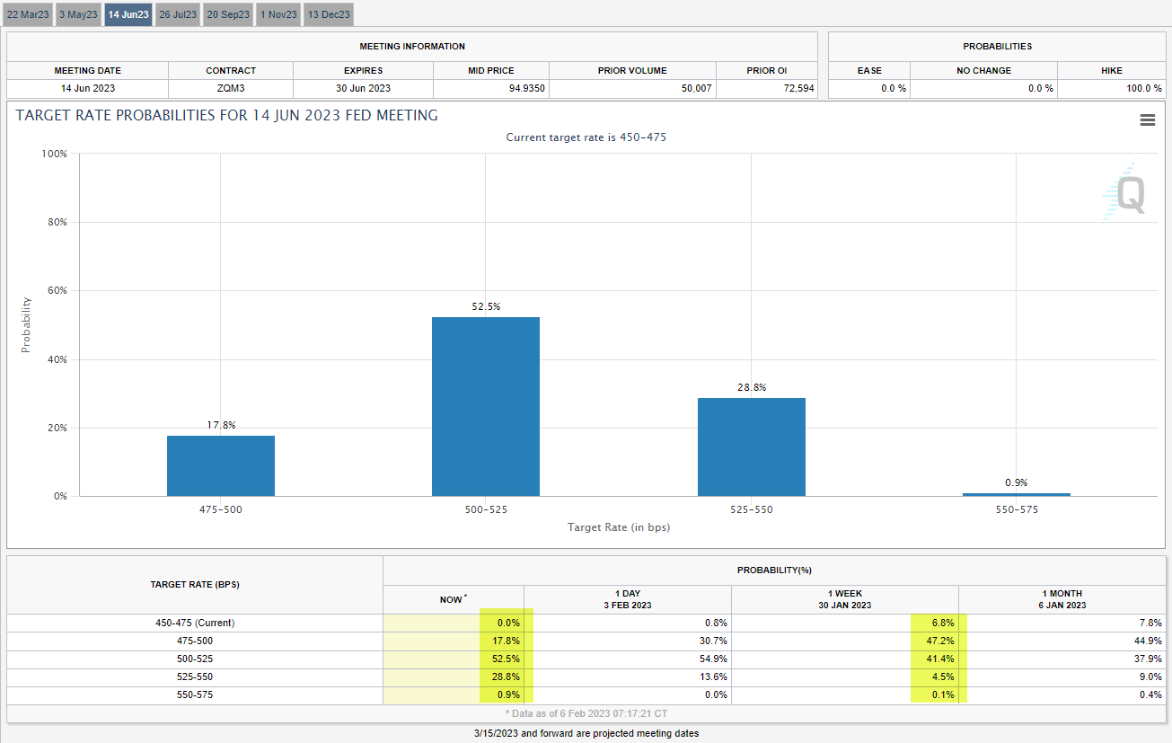 Fed fund futures are now pricing in a more aggressive path of future rate hikes, with the odds of the Fed funds rate landing in the range of 5.25% - 5.50% in June having increased from 4.5% a week ago, to 28.8% today: