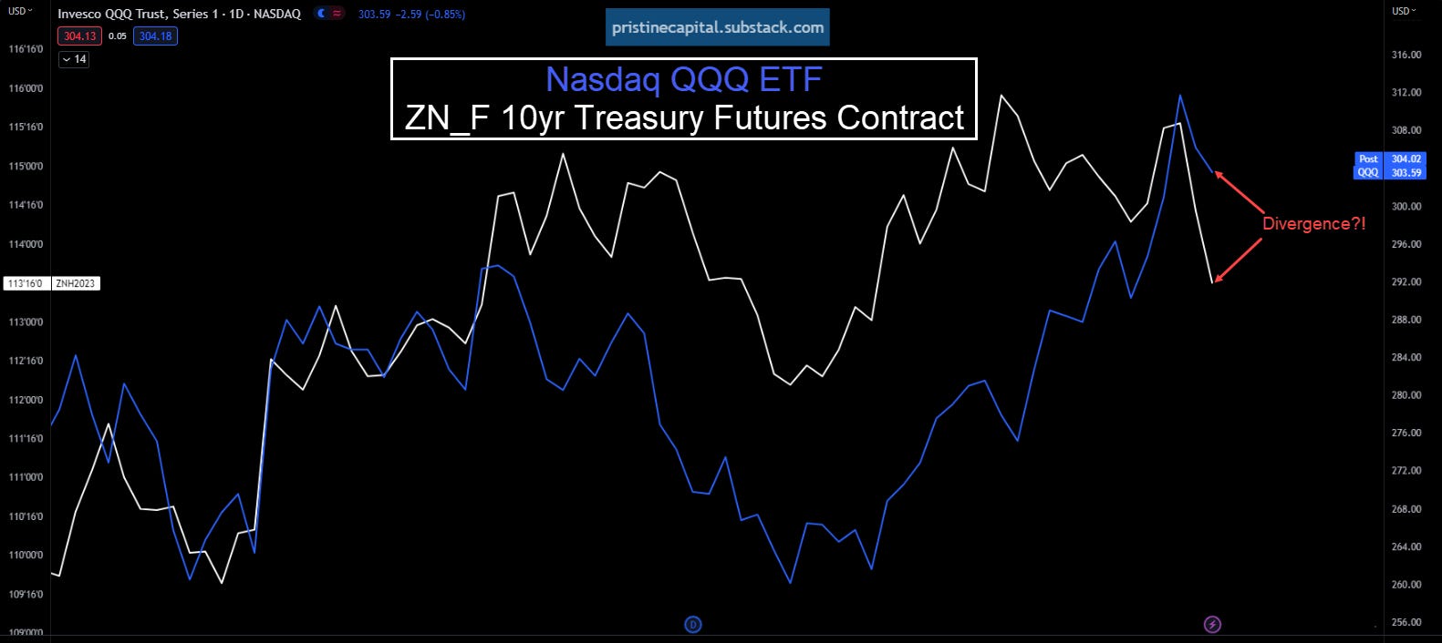 As one might expect, this led to a pullback in equities, but they were a bit more resilient than I expected given the carnage in the bond market. The Nasdaq, which typically moves in lockstep with the 10yr treasury futures contract, diverged today. Beware of the jaws!