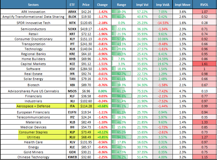 Almost every day since the beginning of the new year, market participants rotated their money out of defensive areas of the market and into risk-on areas, but today was a change of character, in that the best performing groups were XLU utilities, XLP consumer staples, and ITA aerospace & defense