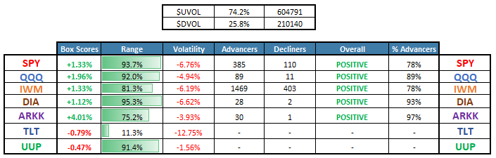 Equities closed on the highs of the day, and with 74.7% advancers! The ARKK innovation ETF led our headline indices, and volatility was CRUSHED!