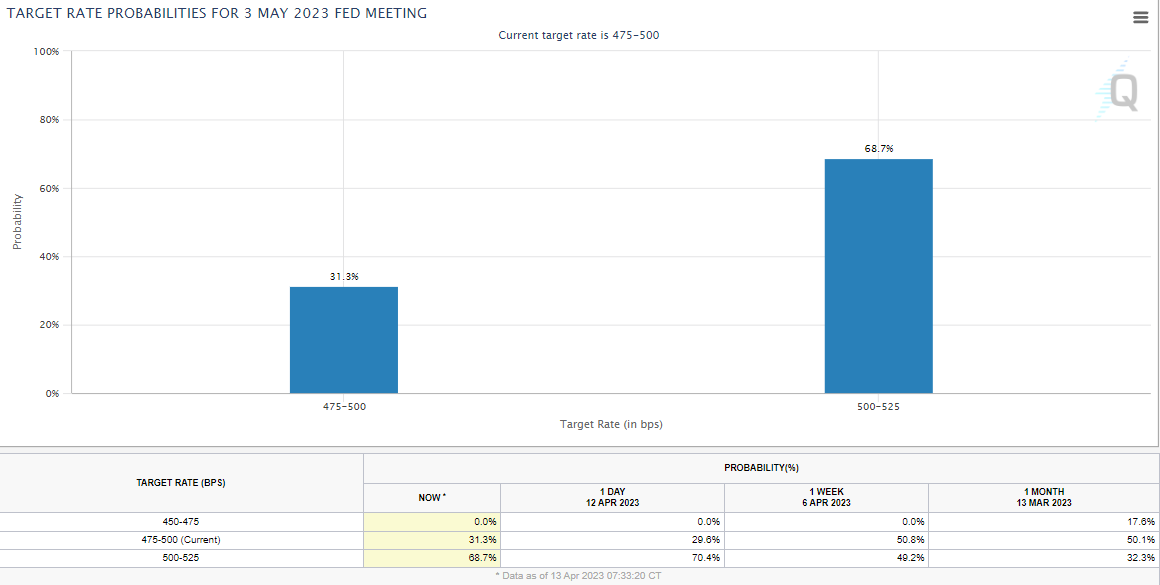 BUT…did this really change anything in the world of Fixed Income? Not really! The market is still pricing in a 68.7% probability of a 25 basis point rate hike in May.