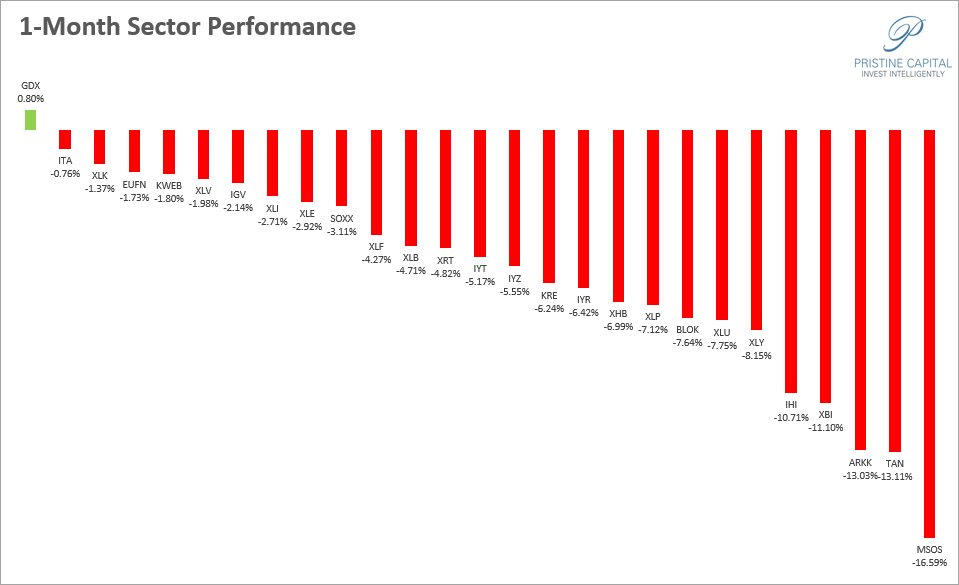 On the 1-month timeframe, GDX gold miners are the only green group. MSOS cannabis stocks…burned out!