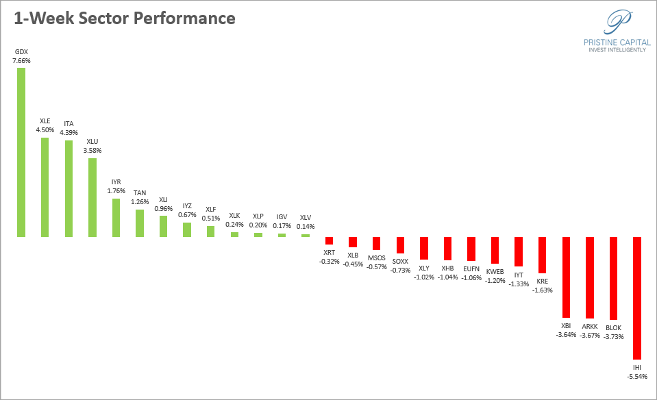 On the 1-week timeframe, GDX gold miners, XLE energy, and ITA aerospace & defense led the market action last week. The geopolitical risk from Israel is being priced into financial markets.