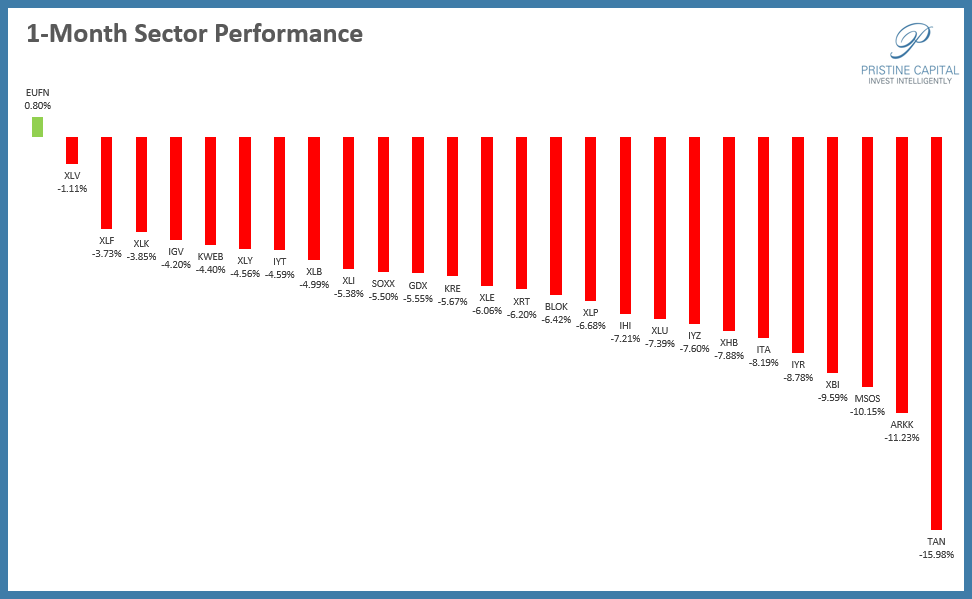On the 1-month timeframe, EUFN European financials stocks are the only green group.