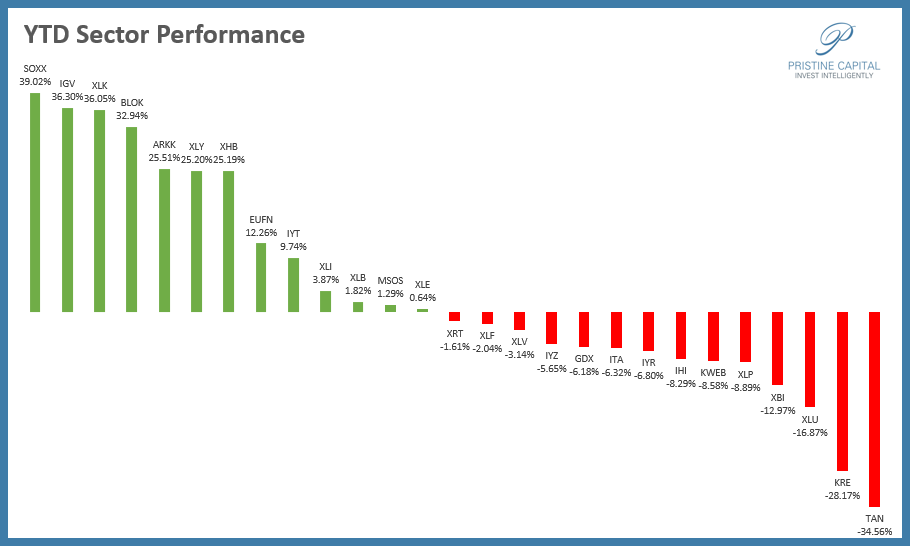 SOXX semiconductor stocks are the YTD winners, with IGV software stocks, and XLK megacap technology close behind. TAN solar and KRE regional banks are the worst YTD performers.