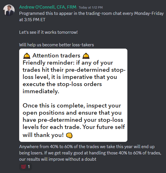 The following risk management message will appear in the “trading-room” discord channel at 3:15 PM on Monday through Friday moving forward.
