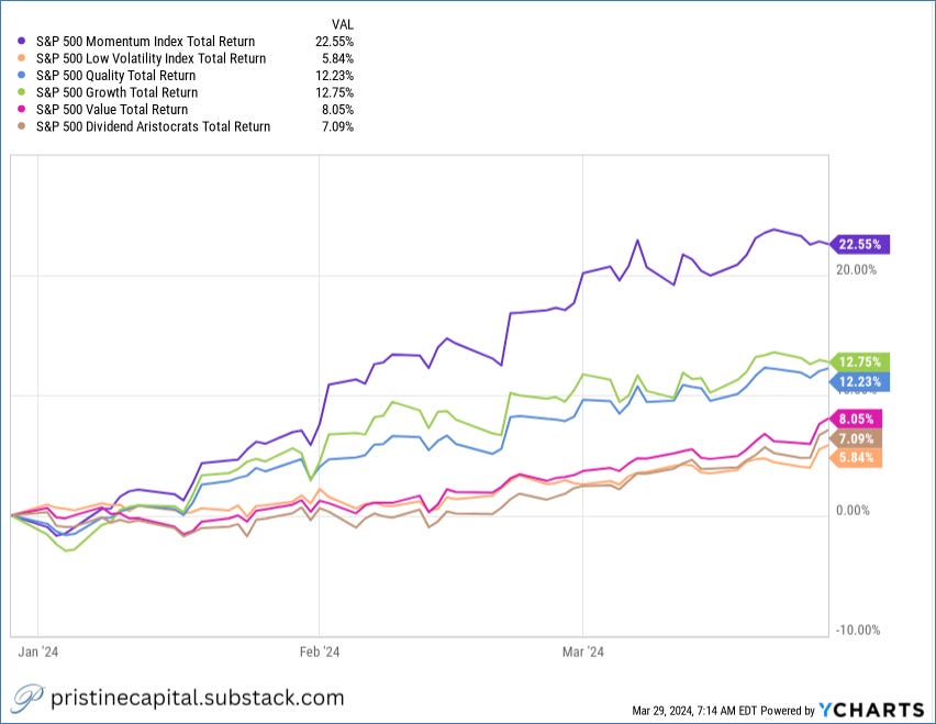The momentum style factor is the clear YTD leader, although the value factor gained ground in the final weeks of Q1 👇