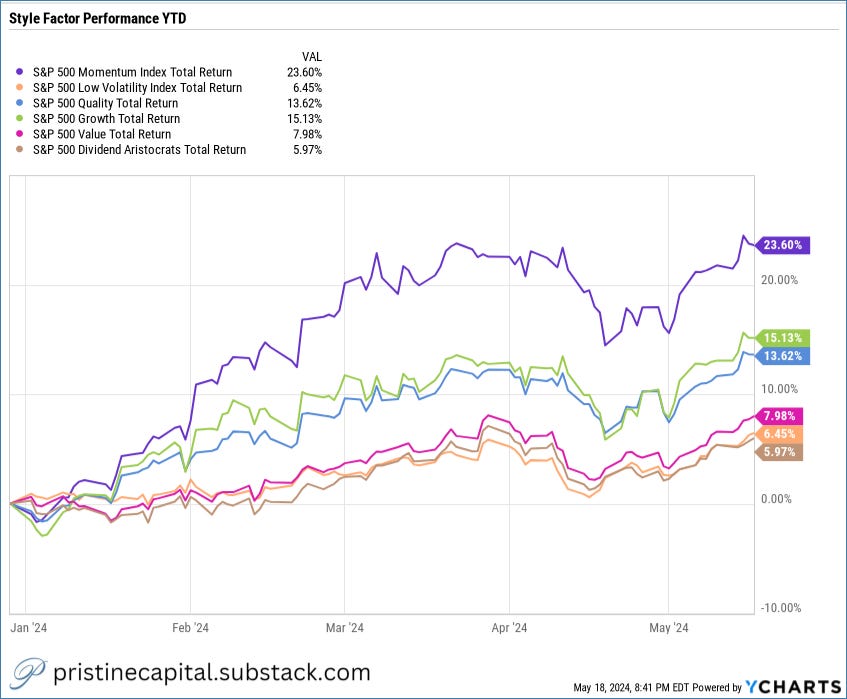 The momentum style factor is leading the action in 2024. NVDA earnings on 5/22 will be a test for this group👇