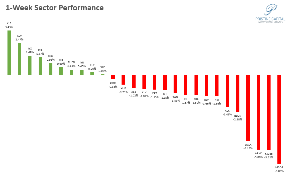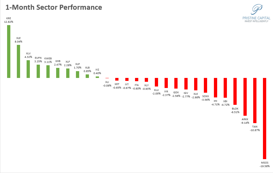On the 1-month timeframe, KRE Regional banks and XLE Energy stocks are outperforming.