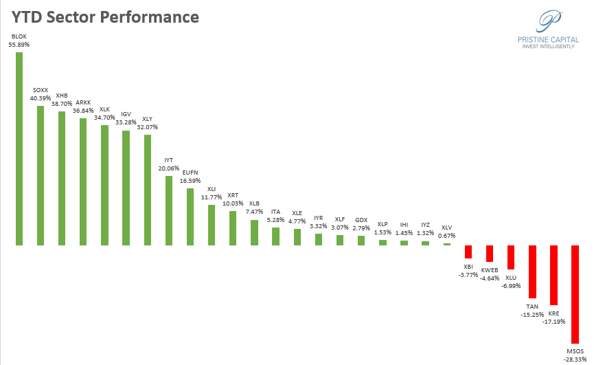 The big winners YTD are as follows: BLOK blockchain technology and SOXX semiconductors. These groups are both experiencing a healthy pullback in August.