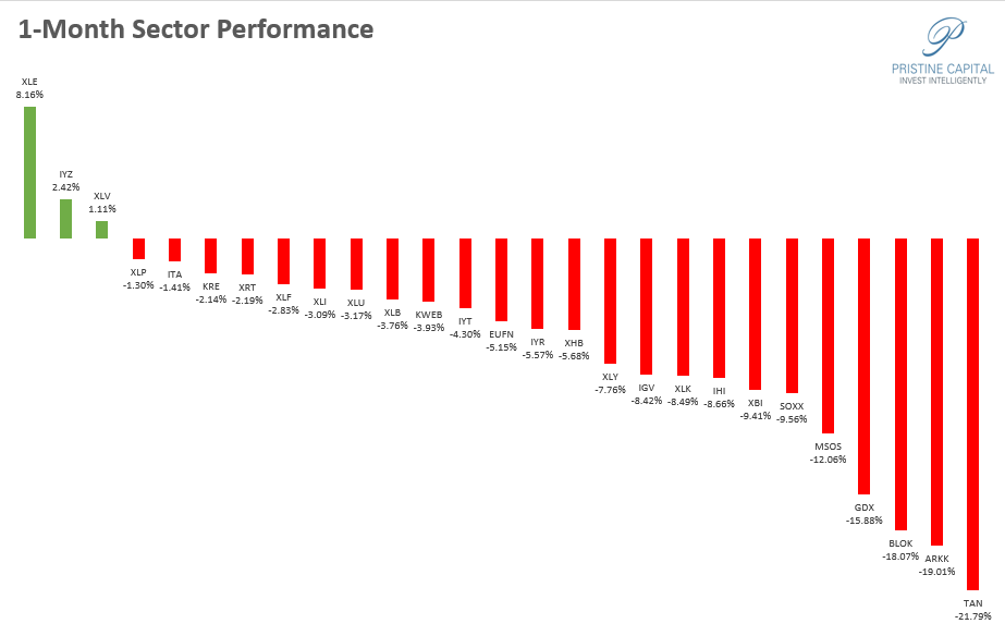 On the 1-month timeframe, XLE energy stocks are leading by far, which is not a great sign for the overall market.