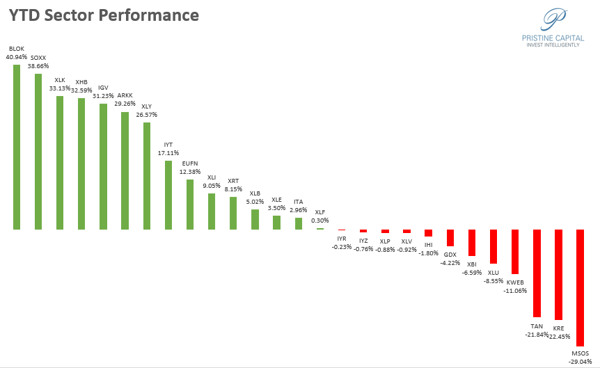 The big winners YTD are BLOK blockchain technology and SOXX semiconductors stocks. These groups have both pulled back significantly off their highs in August.