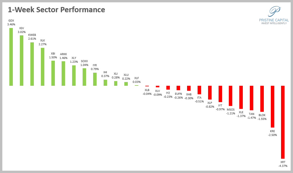 On the 1-week timeframe, GDX gold miners are leading, and XRT retail stocks were the worst performer. This looks like a recession trade that could be hitting the tape. Will be watching for continuation of this theme this week.