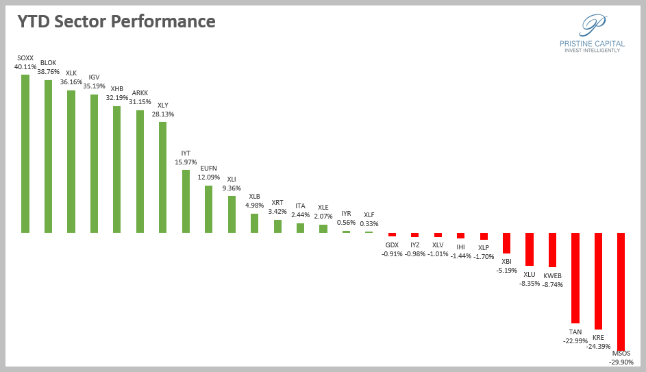 The big winners YTD are BLOK blockchain technology and SOXX semiconductors stocks. These groups have both pulled back significantly off their highs in August.