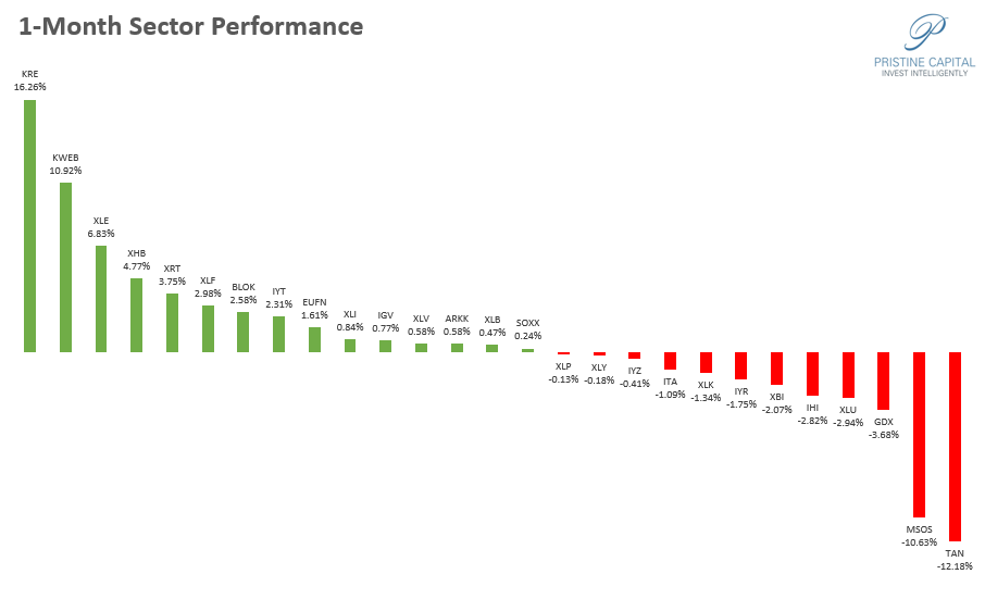 On the 1-month timeframe, KRE Regional banks are the standout by far! KWEB China internet stocks are in the #2 slot. Worth watching this group for test trades as the valuations in China stocks are much cheaper than their US counterparts! When this group trends, it can move sharply.