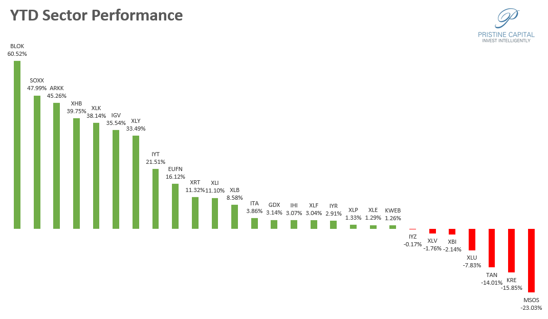 The big winners YTD are as follows: BLOK blockchain technology and SOXX semiconductors. MSOS cannabis stocks are at the bottom of the pack.