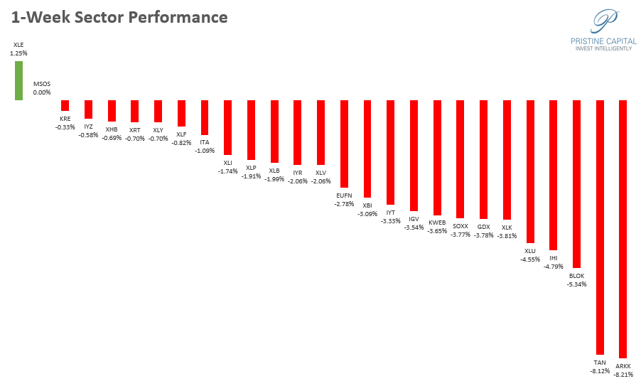 XLE Energy stocks were last week’s top performers in a sea of red.